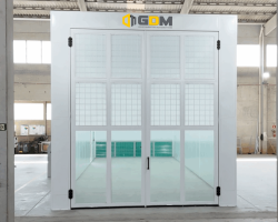 O sistema de ventilação da GRECALE funciona por arrasto/exaustão, criando um fluxo de ar contínuo e controlado que impede a formação de over spray. O ar entra pela parte superior do frontal, passando por um sistema de filtragem fina, e sai pela parte traseira através de grades com painéis filtrantes.