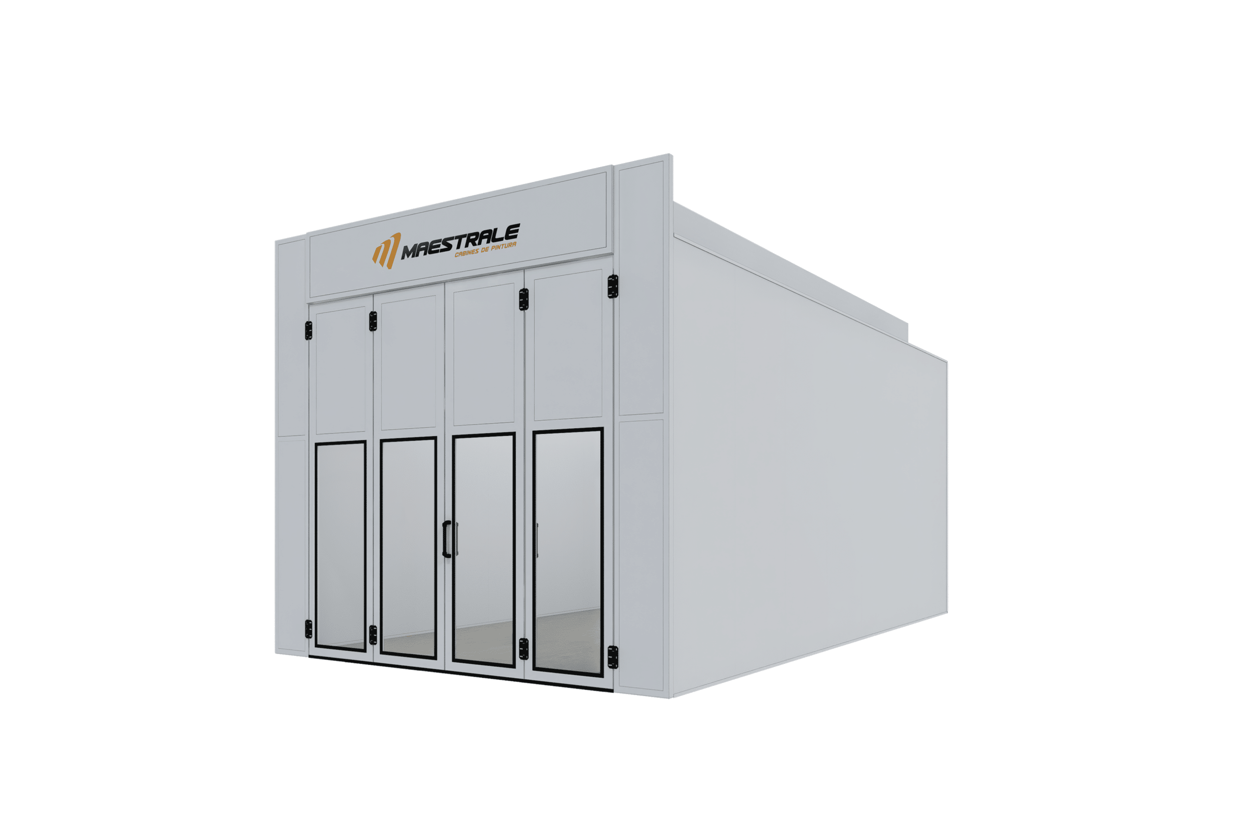 Seu projeto robusto conta com chapas duplas em EPS de 50 mm. A iluminação superior inclinada com lâmpadas LED proporciona visibilidade uniforme, reduzindo sombras e facilitando a execução dos reparos, contribuindo para o maior controle de qualidade.